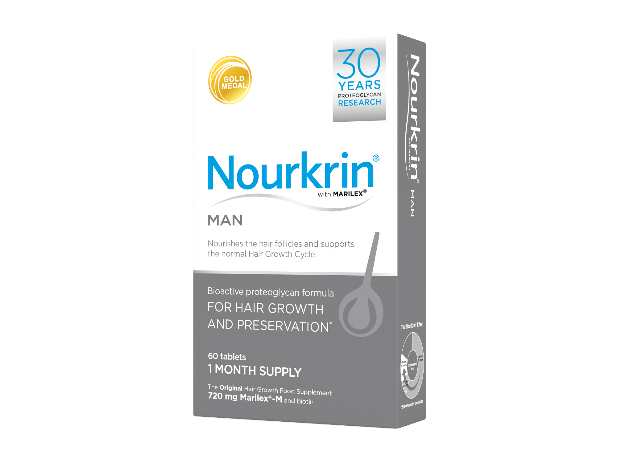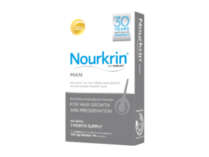 Nourkrin® Man hárbætiefni fyrir karlmenn. Inniheldur 720 mg Marilex-M – Vaxtarprótein formúlu (próteóglýkan formúla) sérstaklega hannaða fyrir hársekki karlmanna og í meira magni. Dregur úr rýrnunarferli hársekksins, örvar og lengir hárvaxtarskeiðið. Lyfjalaust, byggir á náttúrulegum innihaldsefnum og er án aukaverkanna. Nourkrin Man Þarf að byrja að nota um leið og fyrstu merki um hárþynningu eða skallamyndun kemur fram og byrja meðferð áður en hársekkurinn sofnar alveg.